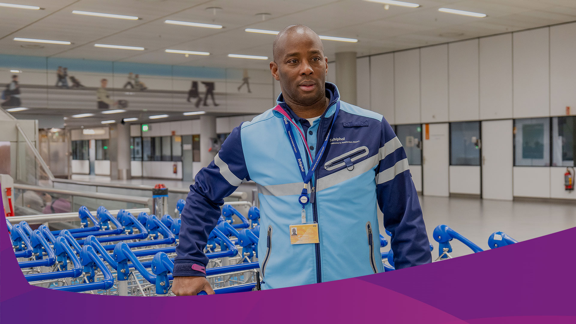 Je draait diensten in een vast team zonder veel managementlagen en waar mensen vaak lang blijven. Soms trek je samen op, soms werk je zelfstandig en houd je zelf het overzicht. Je loopt in Schiphol-uniform tussen passagiers, krijgt vragen en staat ze kort te hulp. Daarna ga je verder met je ronde: je loopt, duwt karren en helpt soms met porterservice bij het dragen en organiseren van bagage. Zo ben je lekker veel in beweging.